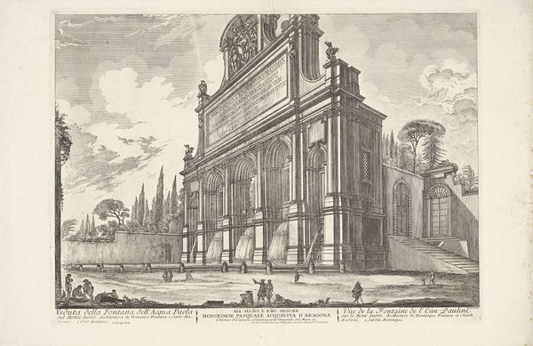 Curator: Look at the intricate detail in Domenico Montaigu's "Achteraanzicht Sint-Pietersbasiliek," an engraving likely created between 1750 and 1799. It offers a unique perspective on St. Peter's Basilica. Editor: The Basilica’s sheer mass strikes me. There’s a definite attempt at monumentality, rendered in cool greys that make it look quite imposing, even severe. Curator: Its Baroque style signifies an important period of Catholic resurgence and power. Think of the political narratives being shaped, the very visible demonstrations of institutional strength following the Reformation. Editor: Certainly. I see how the cityscape sets up a series of planes—foreground, midground, background. What structural devices are at play? The play of light and shadow and perspective... it pulls your eye towards the Basilica, but it also imprisons it. Curator: It's not simply about aesthetic appeal. We have to understand the work as existing within systems of power, papal authority visibly manifested. What narratives are embedded within its rendering and reception? For whom and by whom was this image commissioned? Editor: A good question! Because the formal lines create a striking three-dimensionality, considering it is, after all, just lines etched into a flat surface. I keep going back to the dome—a focal point structurally and, you point out, politically and culturally. It draws your attention and refuses to release it. Curator: Consider also that the architecture is presented with people scaled against it. How does this affect one's understanding of power? Or, on a more micro level, class, identity, and even resistance? These are not simply anonymous people; their position contextualizes the edifice. Editor: Perhaps that scaling is about fostering a sense of awe. By manipulating size, Montaigu emphasizes the Basilica's dominance over everything surrounding it, the individual included. Curator: Ultimately, Domenico Montaigu's work provides a lens to dissect not only architectural form but also sociopolitical hierarchies embedded within its construction and reception. Editor: It certainly showcases how deeply form and function intertwine. From the formal elements, such as line and tone, to the implied narratives around authority, the engraving leaves a lasting impression.