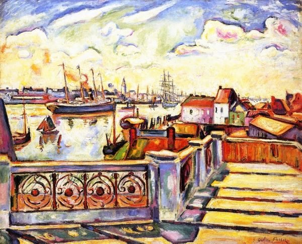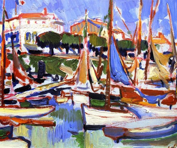 Curator: Looking at Kandinsky’s "Study For Autumn Landscape With Boats," painted in 1908, the first thing that strikes me is its vibrancy. The application of paint, the almost raw color choices—it feels very alive. Editor: Alive and agitated, I'd say. The color combinations, the clashing of the hues, especially that acid yellow, suggests a societal anxiety simmering beneath the surface of bourgeois life. What were the social tensions Kandinsky might have been processing through this piece? Curator: I'm drawn to the impasto, the thick layering of the oil paint. It emphasizes the physicality of the work itself. Each brushstroke feels deliberate, highlighting the artist's process and labor. It’s more about the experience of making than a perfectly rendered scene, right? Editor: Precisely! The gestural application transcends mere representation. We see Kandinsky grappling with modernity, with how rapidly capitalism and industrial production changed not just landscape, but also human relations and the experience of time. How might the boat industry, and all those anonymous labourers, influence his abstract reflections here? Curator: Well, this pre-dates his full abstraction, and the reference to "boats" in the title, as well as their representation, anchors it to a more recognizable world, even as it teeters on the edge of pure form. It does prompt me to consider what type of pigments were available to him at the time, how industrial processes of paint manufacturing might have allowed for brighter, more intense colors than ever before. Editor: And it pushes us to consider who has access to leisurely boat trips, to beautiful landscapes in general? Was Kandinsky consciously commenting on wealth and access through this painting? It's difficult to look away from these visual tensions, which reflect similar tensions present in his culture and possibly within the artist himself. Curator: It seems almost revolutionary to embrace this intensity in landscape art, moving away from the romanticism of the past and towards the raw emotion felt through the experience of landscape itself. A pure celebration of color. Editor: Color is a political language too, however! It reflects anxieties and pleasures of this transitional time period. Thinking through that lens gives it a layer beyond mere surface appearance. Curator: That's what is so engaging about viewing these types of artworks, centuries later. There are layers of interpretation that add depth to the surface! Editor: Exactly, by contextualizing "Study for Autumn Landscape with Boats" we have explored just one pathway for illuminating these complex works.