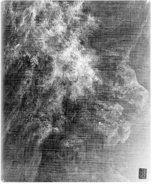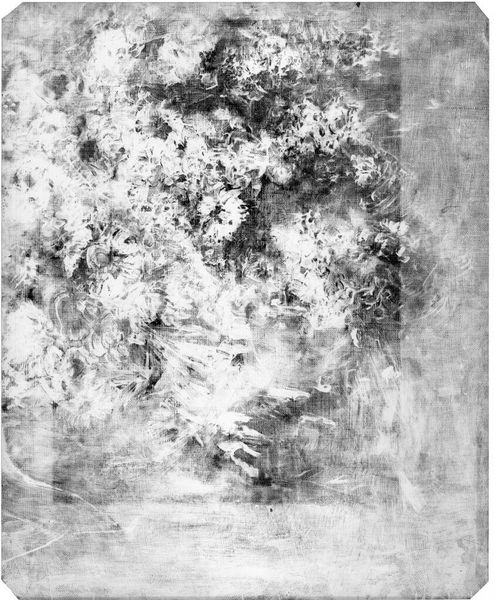 Editor: This is an X-radiograph of "Portrait," possibly by someone from the school of Caspar Netscher. It's a ghostly, ethereal image. What do you see in this piece, especially considering its unusual form? Curator: The monochromatic scale emphasizes the structural composition. Note how the varying densities articulate form and void, creating a visual rhythm. The swirling brushstrokes, now revealed beneath the surface, dictate the underlying dynamism. Editor: So, it's about the unseen structure, the artist's process, and the play of light and shadow that an x-ray reveals? Curator: Precisely. It’s the skeletal architecture of the painting itself, a testament to the artist's technique and our ability to deconstruct visual representation. Editor: I never thought an x-ray could be so revealing about form and technique. Curator: Indeed. It offers a unique perspective on artistic creation.