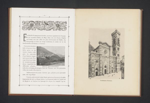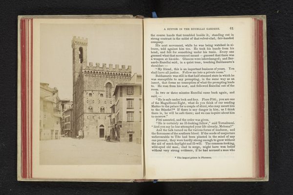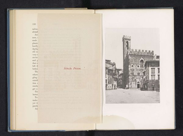 Curator: This is a fascinating find—a photographic print entitled "Exterieur van het Palazzo del Podestà te Florence," taken before 1888 by Edizione Brogi. It’s presented within the pages of what looks to be a book. Editor: It certainly has a solemn air. The architectural massing feels monumental, austere. There is also this stark tonal contrast between the building and the openness of the Florentine square. Curator: Indeed. Brogi’s choice of medium—photography reproduced in print—is particularly interesting. It makes the city's physical reality accessible while engaging in mass consumption via printing techniques. Editor: From a formalist standpoint, the photograph's strength lies in its balance of light and shadow, which highlights the geometric perfection of the Palazzo. See how the lines draw your eye up the tower? The careful framing suggests a deeper intent beyond just documentation. Curator: Agreed. However, it is impossible to look beyond Brogi’s socioeconomic context. Printing images democratizes art, creating widespread representations of Renaissance ideals. Editor: Still, look at the Renaissance palazzo. Consider the symbolism: the imposing structure suggests permanence and stability. It acts as a potent signifier of civic power in Renaissance Florence. Curator: True, the work reproduces power but remember, photography and the printing process here allow a wider audience to view and discuss the symbolic impact. Brogi’s work participates in shaping a broader, more accessible Renaissance identity. Editor: So, the architectural geometry is meant to evoke order and clarity, classic values. Curator: Precisely, these historical printing techniques offer a perspective on 19th-century engagement with classical ideals in a period shaped by burgeoning consumerism. Editor: An interesting intersection. It also speaks volumes about the durability and influence of classical artistic visions. Curator: A perfect image for consideration, melding aesthetic, material production, and the spread of ideas.