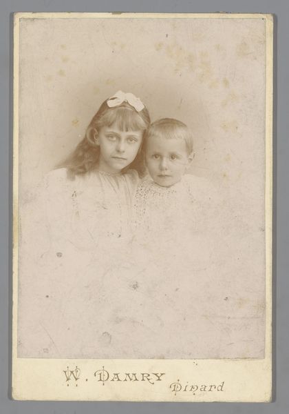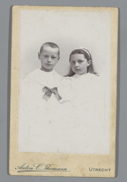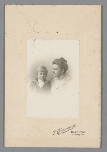 This photographic portrait of an unknown woman and a girl was made by Fotografie Modern. The studio name is printed on the card mount, advertising the business in Amsterdam and Boskoop. At the time this photograph was made, the late 19th or early 20th century, photography was becoming more accessible to the middle classes. As a commercial product, photography relied on factory production of dry glass plates, and standardized chemical processes to develop images, as well as mass produced paper. These material and processes of photographic production, combined with the studio's business, had the effect of democratizing portraiture. Rather than commissioning a painted portrait, a family could visit a photographer's studio, and, for a modest price, have their likeness captured in a permanent form. Looking at this photograph, we can imagine the studio visit as a social ritual, with the sitters dressing in their finest clothes, and carefully composing themselves for the camera. Recognizing photography as both art and industry invites us to consider the social dynamics of consumer culture and to appreciate photography's impact on representation and identity.