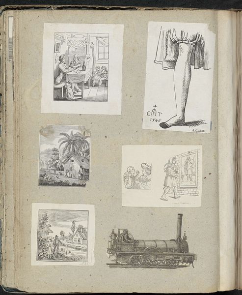 Editor: This is a page from a sketchbook, entitled "Albumblad met diverse voorstellingen" created between 1814 and 1869. It includes etchings, ink drawings, and pencil sketches on paper. There’s something almost dreamlike about its fragmented nature… What connections or disconnections do you see across these images? Curator: This page offers a glimpse into the visual culture and perhaps the political sensibilities of the time. The juxtaposition of genre scenes, exotic animals like the zebra, and miniature landscapes—including one with what appears to be a volcano—invites us to consider the contemporary European gaze. Consider how the artist positions the “exotic” alongside everyday life. What does that say about how Europeans understood their place in the world? Editor: So, you're suggesting it's a reflection of a Eurocentric worldview? I hadn't really considered that. Curator: Precisely. The sketchbook can be viewed as a personal archive, and the artist’s selection and arrangement becomes a statement, however subtle, about their values and understanding of their time. Notice the prevalence of images alluding to commerce and perhaps leisure. How might these reflect the emerging bourgeois society and its values? Editor: I see what you mean now! The grouping feels intentional, not just random sketches. I guess I was seeing it only as a collection of drawings instead of something more meaningful. Curator: Exactly! This approach urges us to recognize that even personal sketchbooks aren’t created in a vacuum, they participate in broader social and political conversations. This little album leaf acts as a silent, compelling witness.