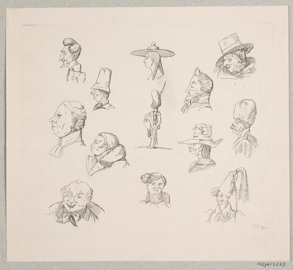 Curator: This is a rather fascinating sheet of studies by Luigi Schiavonetti, made around 1804. It’s entitled "Sleutel bij de prent 'Het lichaam van sultan Tippoo wordt herkend door zijn familie' (en een andere prent)". Editor: What strikes me first is the almost clinical detachment of the line work. These are studies, yes, but there's a starkness in the way the artist captures the angles of the faces, especially around the figure labeled as Tippoo's corpse. Curator: Indeed. Schiavonetti created this as a preparatory drawing for an etching depicting the aftermath of the Siege of Seringapatam. Tippoo Sultan's defeat marked a significant moment in the British expansion in India. Notice how the composition is divided: the upper section showcases studies related to the assault, while the lower focuses on the Sultan's family identifying his body. Editor: I’m intrigued by the variance in texture achieved purely through line. The hats and turbans have a tangible weight, a sense of the materials used to create them. Observe how the shading builds form, creating a hierarchy of light and shadow that guides the eye. Curator: Absolutely. These details tell us about the importance that the British placed on the taking over the Seringapatam. Schiavonetti's preparatory work provides invaluable insights into the visual strategies employed to legitimize colonial power through art. It's also quite telling to notice how much effort went into illustrating even minor figures. Editor: There's something unsettling about the evenness of detail across the sheet. Every face, whether British officer or member of Tippoo's family, receives a similar level of attention. It complicates any straightforward reading of colonial triumphalism. Curator: A valid point. These images ended up in British households, influencing perceptions of empire. The exoticized, romantic depiction subtly reinforces a sense of British superiority. Editor: And, in that, a visual representation of historical dominance becomes something we can deconstruct and consider anew. Thanks for the illumination. Curator: My pleasure. This artwork gives us the opportunity to dissect how historical events can be translated through artistic skill into lasting political narratives.