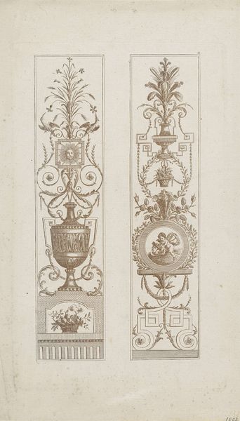 Editor: So, this is "Negen affuiten en ornamenten voor geweren" from 1692, by Pieter Schenk. It's a print showcasing detailed designs for decorating firearms. I'm immediately struck by the ornate detail; it feels almost decadent for something designed for weapons. What stands out to you in this piece? Curator: What immediately grabs my attention is how these weapon designs exist at the intersection of power, status, and artistic expression within 17th-century Dutch society. We often forget that weapons, particularly for the elite, weren't simply tools of war. They were potent symbols of social standing. Consider the Baroque style; how does its emphasis on elaborate ornamentation serve to legitimize and reinforce hierarchical power structures? Editor: That's a perspective I hadn’t considered. So, the embellishments aren't just aesthetic; they are communicating something about class and authority? Curator: Precisely. And more than that, think about the labor involved in crafting these pieces. Who were the artisans? What were their socio-economic circumstances? Were they freemen or part of a guild? How might issues of identity, class, and even gender inform the narratives embedded within these objects, challenging or subverting the dominant ideology? The inclusion of images, possibly portraits, only strengthens this point. Editor: This gives me a lot to think about! I was just seeing pretty ornamentation, but it represents so much more about the culture and societal structures of the time. Curator: Indeed. Seeing this print today, we're not merely observing firearm designs; we're confronting questions of power, violence, and representation that are still acutely relevant today. By unpacking those layered meanings, we can really dig into the social impact that something as “simple” as weapon design carries. Editor: Thanks! It’s fascinating how a different lens really brings forward all those deeper questions!