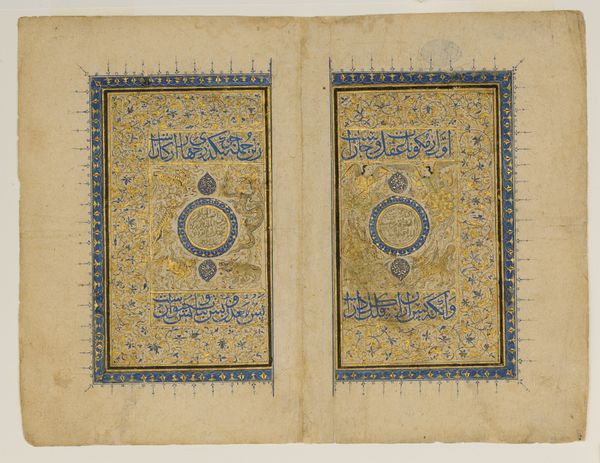 Curator: This illuminated page comes from the Koran, dating back to around the 12th century. It resides here at the Minneapolis Institute of Art. I’m immediately struck by the dense patterning. What captures your attention? Editor: For me, it’s the interplay between the stark geometry of the Kufic script and the flowing, almost organic, ornamentation surrounding it. There's a kind of controlled energy in the composition. You get a sense of both structure and freedom coexisting. Curator: Absolutely. Thinking about the materials used – primarily ink on parchment – it's a testament to the skill and the labor involved in creating such a piece. Preparing the parchment, mixing the inks from natural pigments, the painstaking process of calligraphy itself. It represents an enormous amount of effort and a kind of devotion. Editor: And when we consider the social context, this page wouldn't have been just an aesthetic object; it was a vital part of religious practice, central to Islamic intellectual and spiritual life. Its production reflects a broader system of patronage and craft guilds that flourished during the medieval period. And while created by individuals it represents more then a sole artisan’s point of view. Curator: Exactly, there's this tension between the individuality of the artist, likely a highly trained calligrapher, and the constraints imposed by tradition and religious doctrine. How would you say the calligraphic style, particularly the angular Kufic script, contributes to the overall meaning of the work? Editor: Well, Kufic script, with its clear, monumental quality, communicates authority and permanence. This particular style connects this piece to its specific era in Islamic intellectual history, especially the use of the red marks that aided in the pronunciation of certain texts. As an artifact, it stands to promote language justice today and honor accessibility of religious material. Curator: It's a powerful example of how material choices and artistic techniques were inextricably linked to cultural and religious values in the medieval Islamic world. This intersection of form and content reveals to modern eyes that the historical value of an object rests also in its artistic execution. Editor: It’s work like this, that makes one recognize the immense labor and skill in material making practices of the era while offering crucial opportunities for interfaith and intercultural discussion. Curator: I agree. Considering its age, the page stands as a testament to the dedication and meticulousness embedded within this work. Editor: Indeed. A reminder of the stories objects tell about belief, skill, and human ingenuity across time.