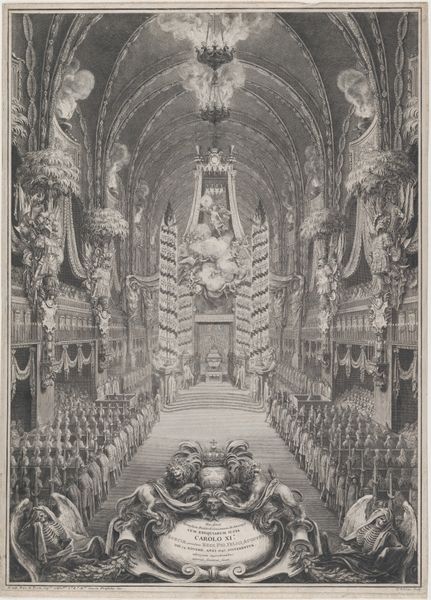 Curator: What a dramatic space—it almost feels endless. What's your initial feeling here? Editor: Claustrophobia. Despite the architectural grandeur, there’s this…crushing weight of faces. I feel like I'm going to be swallowed by the crowd. Curator: Well, this is "The States General of France" by Jan Ziarnko, created in 1614. What we're seeing is an engraving that captures a pivotal moment of political assembly in France during the Baroque period. Think of it as a visual record imbued with symbolism about power, order, and representation. Editor: Representation… that's a generous word, looking at those masses of people! There's something unsettling about their uniformity, like they're faceless blocks. And those floating figures above—angels? What’s their deal? Curator: Yes, figures holding what seems to be a sword and an olive branch. It plays into the visualization of a heavenly blessing on earthly affairs, particularly the French monarchy. The crown and shield right above suggests divine right and legitimacy. This era was all about visualizing hierarchies, and Ziarnko employs this vertical composition quite deliberately. Editor: Hmm…a divine blessing seems heavy-handed considering all the social turmoil brewing back then. The perspective feels so…constructed. It's not showing the real messiness of politics, is it? The etching feels sterile, even calculated. Curator: Perhaps. But that's the point! Through this structured style of line and architectural space, the artwork isn't just showing you a gathering. It communicates an ideal—of a unified, divinely ordained France. But the success of the symbolism, as you point out, is perhaps arguable with the advantage of historical hindsight. Editor: So it's propaganda masquerading as historical record? Makes me think about the stories we tell ourselves—and the ones left out of the picture. You see divine order; I see political manipulation. Curator: And that tension between order and chaos, the ideal versus the real, is what makes the image resonate. It becomes a snapshot of a moment where those fault lines were already forming. Editor: I suppose you're right. It's not just a depiction, but an interpretation…a statement in visual form. That changes things, makes it less about the crowd and more about the idea behind the crowd. Curator: Exactly. A perfect example of cultural memory, continuously molded and reshaped through symbols.