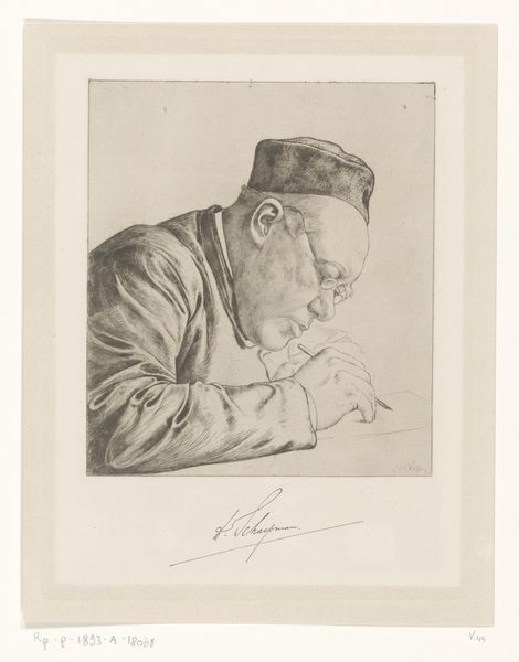 Editor: This drawing, “Portret van J. van der Vegt, schrijvend,” by Jan Veth, created sometime between 1874 and 1925, is rendered in pencil. There's a real stillness and focus to it. What aspects of this piece resonate with you? Curator: The portrait, I think, is less about representing J. van der Vegt literally and more about exploring the intellectual labor and the performance thereof. Who was considered an intellectual? How does that relate to class? What kind of labour is deemed worthy of documentation? These are things I wonder about when viewing this piece. Editor: That’s an interesting point. It makes me consider the relationship between the artist and the subject and whose perspective is really being presented here. How would class dynamics of the time influence how we perceive intellectual labour? Curator: Exactly. We must ask who has historically been granted access to literacy and scholarly pursuits. I encourage you to think of this portrait not merely as a record but as a negotiation of power. Editor: It definitely changes my initial perspective of quiet study to one where I am encouraged to think about the dynamics that existed then and persist today. It goes beyond a simple likeness. Curator: Precisely! By engaging with its socio-historical context, a seemingly simple drawing invites much broader inquiries into representation and privilege. Editor: That’s given me a lot to consider about how we value labour and who we choose to depict.