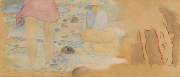 Editor: This is Maurice Prendergast's "Marine Park," painted in 1897, using watercolor. It's fascinating to me how he captures this leisure scene. What's striking is the raw texture; it almost feels like you can trace the movement of his hand as he laid down the paint. What do you make of it? Curator: The beauty lies in Prendergast's process. Notice how he doesn't try to hide the fact that it's made of pigment and paper; instead, he flaunts it. This isn’t just a park scene; it is a product of material and labor, like the parasols that create an economy. He is really dissolving the lines between representation and objecthood by bringing those details front and center, isn’t he? Editor: So, you are saying it's not just what's depicted, but also about how it's depicted. What are some of the specific material elements that draw your attention in that sense? Curator: Look closely. The almost visible strokes build into those complex figures. We aren’t just seeing ladies at leisure; we are seeing the materiality of leisure. We see the umbrellas as products, and the handwork within it. The flattening effect isn't just a stylistic choice; it emphasizes the object quality of the image, reminding us that this is pigment applied to paper. Even the social aspect comes back to that production: how were they able to acquire such lavish material goods that helped shape these outdoor park gatherings? Editor: It makes me think differently about Impressionism altogether. It’s not just about fleeting moments; it's also about capturing the production of those moments! Curator: Exactly! It’s about revealing the mechanics behind the appearance, which I find exciting to think about further.