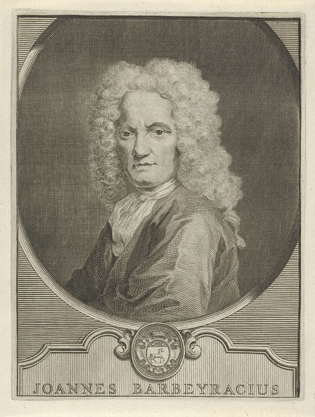 Editor: This is Jacob Houbraken’s engraving, "Portret van Willem van Citters," created sometime between 1757 and 1759. The detail is amazing for an engraving! I'm curious about the process… What's your take on this portrait? Curator: I see an object born from intense labor and the application of specific materials. Engraving, unlike painting, demands a rigorous, almost industrial process. Each line is physically etched into a metal plate, a testament to the engraver's skill and the economics of portraiture in that era. Notice the elaborate frame—more than just decoration, it signifies value and social status both for the sitter and, crucially, for the print's intended consumer. Editor: So you’re saying the *making* of the image reflects something about society then? Curator: Precisely. How might the proliferation of printed portraits democratize image ownership, while simultaneously reinforcing existing class structures? The labour, materials (metal, ink, paper), and the skills necessary dictated who could afford to have and commission these prints, and therefore, whose image would circulate. Is this really democratization? Or another form of consumption? Editor: I never considered the economic side so directly! I was focused on the artistic style, the Baroque influence. Curator: Style isn't divorced from material reality. The Baroque love of ornamentation demanded specialized labor in creating the elaborate frame and even Van Citters' clothing; look at the wig and lace, the materials speak to trade, and a particular social performance. Editor: Thinking about art this way really puts the focus on production and consumption. Curator: Absolutely. Examining art through its materiality reveals a complex network of social relations and economic forces at play. Consider next time who makes art, for what, and out of what stuff.