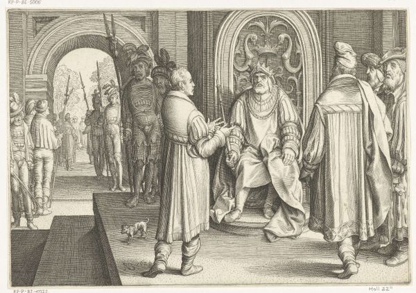 Curator: What a dramatic scene! This is “Christus voor Pilatus,” or “Christ Before Pilate,” an engraving made in 1623 by Ludovicus Siceram. The stark black and white really heightens the tension. Editor: It feels theatrical, doesn't it? The composition—the way Pilate is positioned above everyone, enthroned, with Christ almost swallowed by the crowd—it emphasizes his power and Christ's vulnerability. Curator: Exactly. And Siceram wasn't just inventing this image. He was participating in a well-established tradition of depicting this moment from the Gospels. Consider the socio-political dynamics embedded in its production as an engraving: How did it circulate, and who was the intended audience for this potent image of judgment and authority? Editor: It's fascinating to think about how readily accessible such an impactful image would have been. Focusing on form, though, the intricate line work conveys the textures of fabric and armor. It’s impressive how much detail Siceram managed to pack in with such a limited palette. The city visible in the background is so sharply rendered! Curator: Right, engravings such as this provided a valuable means for disseminating narratives. Consider the labor involved in producing the copperplate used for its creation—a skilled craft itself. Each line etched contributes to both aesthetic effect and to making these crucial stories accessible to those outside the circles of wealthy patrons of the time. Editor: Yes, you can see the influence of printmaking on Baroque aesthetics in its overall emphasis on contrasting tones to create dramatic focus and volume. And even the very slight distortions in perspective and the exaggerated gestures – they seem tailored for mass reproduction. Curator: It prompts one to wonder what interpretations people placed on this narrative during that period, influenced by material circumstances and prevailing sociopolitical conflicts. What meanings did audiences extract from this version? Editor: Perhaps Siceram was pointing us not just toward the past, but inviting reflections about how moral authority and justice were – and continue to be – negotiated. What seems constant is art’s capacity to confront its audience and invite active viewing and continued debate.