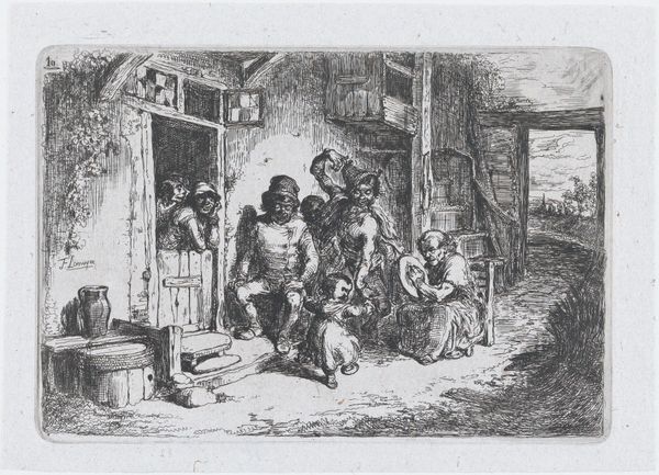 Editor: We're looking at "Plate 4: a street brawl, from the series of customs and pastimes of the Spanish people," an etching by Francisco Lameyer y Berenguer, made around 1850. The first thing that strikes me is the dynamic composition and the chaotic energy; you can almost hear the shouts of the men. What details of this etching do you find most compelling? Curator: The concentration of tonal values in the central brawl creates a powerful focal point. Note how the artist has used cross-hatching to develop shadow and volume. The foreground figure serves to frame and thrust the brawling group further into the viewers space. Editor: I notice the line work is quite detailed, especially on the figures. What does that detail suggest to you about the artist’s approach? Curator: Indeed, the intricate etching technique yields both definition and a degree of realism to the human form, enhancing the overall dramatic effect. Consider the varying line weights; thinner lines describe figures in the background and create depth of space while thicker lines characterize the emotional drama between fighting men. Lameyer utilizes light and shadow contrast, strategically placing his characters into focus for their active engagement. How might one assess Lameyer’s use of perspective in establishing spatial depth? Editor: I suppose the figures are more compressed as they move into the distance to provide a sense of space. Do you think the realism style would accurately depict the subject? Curator: Note how the style employed underscores the work’s commitment to observational accuracy, allowing Lameyer to articulate both the historical specificity of a street fight. The dog and other minute elements surrounding this event serve as secondary features. Did you discover the formal relations to successfully describe conflict, chaos and tension? Editor: Yes, it is intriguing to see how technique shapes our perception. Thank you for the illuminating insights! Curator: An insightful discussion indeed.