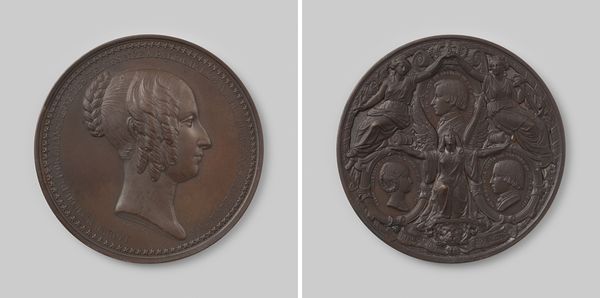 Curator: Examining this relief in bronze by M. Borrel from 1834, titled "Establishment of the Iron Cross, in honor of Leopold I, King of the Belgians," I’m immediately struck by the circular composition. It's contained and, perhaps, self-referential. Editor: It feels distinctly melancholic to me. The bronze has a muted quality and even though this is meant to commemorate an establishment, a royal honor no less, there's an inescapable somber tone. Curator: Absolutely. Knowing the context enriches that reading. Leopold I took the throne of a newly independent Belgium in 1831 after a period of upheaval and revolution. This medal marks that fraught establishment of a nation and a monarchy, and Borrel crafted this four years after the start of Leopold's reign. Editor: From a formalist viewpoint, note the portrait's profile view, echoing classical Roman coin design. Also, observe the use of both inscription and image to define the entire surface of the round space. Semiotic interplay is also central here. The Iron Cross symbol merges historical reference and power into one concise visual form. Curator: And the Iron Cross itself became a symbol that could, and still can, carry complicated weight, as this was initially created during the Napoleonic Wars. Context informs everything. It acknowledges military prowess tied to a new national identity. One can then unpack the medal's narrative to highlight its use in solidifying class divisions during the earlier stages of industrial capitalism, no? The monarchy benefits most when recasting war as spectacle and national myth. Editor: Precisely. Borrel is very much working within established, academic-art conventions and portrait styles, even down to the monarch's uniform. The surface design reflects the time's aesthetic embrace of heroism and power, though maybe to a restrained level. It lacks grandiosity. Curator: True, and this gets us back to the initial impression of solemnity and perhaps a recognition, or warning even, of what maintaining power might cost a new king in those days. There is much more to the creation of a cross, image and medal. Editor: It seems that even under simplistic structure, material and arrangement this little piece remains multi-layered.