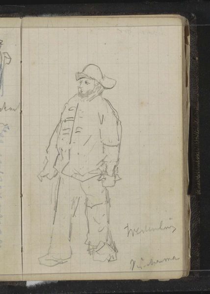 Editor: Here we have Jozef Israëls' "Lopende jongens met takkenbossen onder de arm", created sometime between 1834 and 1911. It’s a pencil drawing, currently held at the Rijksmuseum. It has an intimate feel, almost like a quick glimpse into another world, but a world weighed down by daily hardship. What do you see in this piece? Curator: This seemingly simple sketch holds a weight of cultural memory. Israëls captures not just boys carrying bundles, but also echoes of labour, resilience, and perhaps a specific regional identity within the Netherlands. Notice how the strokes defining the bundles mimic the boys' own hunched postures; the burdens they carry become visually synonymous with their very being. It prompts us to reflect on cycles of poverty, yet avoids romanticism through the direct gaze and worn clothing. Do you think the unfinished quality of the sketch enhances or detracts from this feeling? Editor: I think it enhances it. The sketchiness makes it feel raw and immediate, less posed, more truthful. It avoids feeling sentimental by being so unrefined. Curator: Precisely! And consider the "takkenbossen"— bundles of branches. Beyond simple firewood, what might these bundles represent on a deeper, symbolic level? Resourcefulness, survival… a constant negotiation with the natural world. Think about how "sticks and stones" form rudimentary dwellings and rudimentary lives in harsher landscapes. Editor: That’s a great point. I hadn’t considered that they represent the fundamental building blocks of life itself in such stark terms. Curator: These elements, rendered through light and shadow, contribute to the enduring impact of this piece. Even the stain on the page becomes part of its story. It all accumulates to present a slice of history. Editor: This has completely shifted my perspective. I went from seeing a simple drawing to understanding its rich historical and cultural context. Thanks! Curator: And I am so pleased to have engaged in unpacking this sketch, its emotional undertones linger. It’s an echo of the past reminding us of the continuous thread of human experience, resilience, and shared burdens across time.