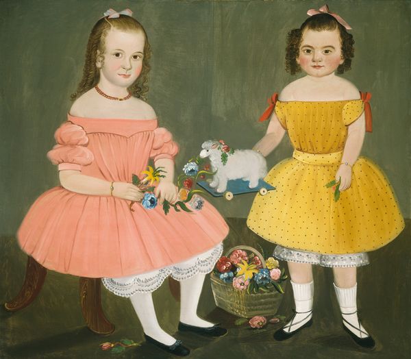 Theodore Pine painted "The Daughters of Daniel T. MacFarlan," a large oil on canvas, sometime in the mid-19th century. During this time, portraiture was still a marker of social status, particularly for the emerging middle class. Here, we see two young girls, likely from a wealthy family, posed in an idyllic landscape, complete with a dog, flowers, and a distant estate. But look closer, and you might notice the subtle ways gender and class are being negotiated. Their clothing, while childlike, hints at the restrictive roles they would soon embody as women. The dark storm clouds in the distance, are they a hint of the turmoil brewing in the country? This painting, like many of its time, invites us to consider the complexities of identity, the weight of societal expectations, and the untold stories hidden beneath the surface of a seemingly straightforward image. It’s a reminder that even in the most serene scenes, power and identity are always at play.