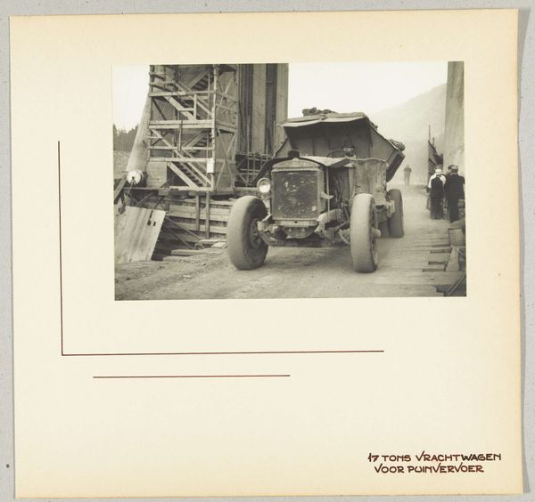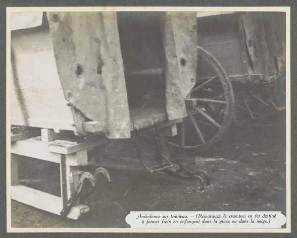 Curator: I’m struck immediately by the subdued tonality. The limited range of grays evokes a palpable sense of bleakness, don’t you think? Editor: Indeed. Let’s contextualize this gelatin-silver print a bit. It's titled "Dokter Cervelli en een militair bij een ambulanceslee in de Dolomieten," dating to 1916. Here we see the good Dokter Cervelli, apparently demonstrating a braking system for what I believe is a trailer ambulance in the Dolomite Mountains. Curator: The vertical lines of the timber buildings in the background offer an interesting counterpoint to the horizontality of the sled itself. I’m curious about the choice to emphasize that contrast in structure. Editor: It highlights the innovative effort in response to the incredibly difficult geographic and political situation in the region at this point in time. Look at the conditions! I'd venture to say it provides important evidence of technological adaption in the context of wartime medical support. It humanizes that crisis, to a degree, right? Curator: You could see it that way. I'm more focused on how the wheel-and-sled hybrid creates this sort of visual tension. There is something quite beautiful about it despite what its function may be, or was. A tension of the antiquated meeting the… well, relatively modern, for the time, anyway. Editor: Perhaps what you perceive is the photographer’s intention of immortalizing an urgent moment and place, the collision of tradition and adaptation in the face of war. It's a document meant to record a very specific event and contribution. It emphasizes technology’s potential during desperate times. Curator: Fair enough. Despite our differing perspectives, this piece makes you consider a lot, doesn't it? Editor: It certainly does, reminding us how vital image-making is, whether one approaches it through visual aesthetics or through the record of innovation amidst global conflict.