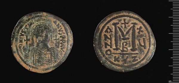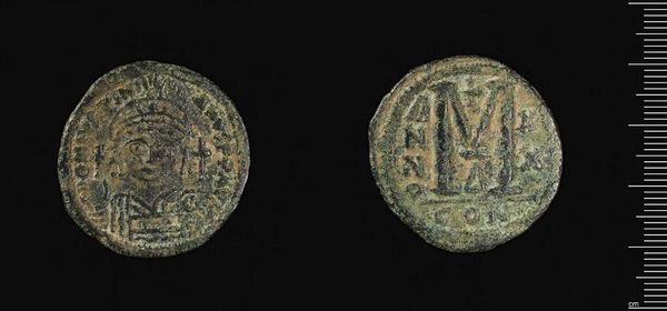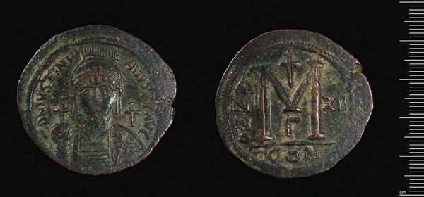 Curator: Here we have a coin of Justinian I, a copper piece held in the collections of the Harvard Art Museums. Its patina suggests a long and complex history. Editor: It’s compelling, isn't it? The verdigris lends the object a sense of temporal depth, almost as if it were exhumed from the very foundations of history. Curator: The coin’s obverse features Justinian, depicted with clear Byzantine imperial regalia, while the reverse showcases a large "M," possibly indicating the coin's value or mint. Editor: Look closely at the coin's reverse; the "M" flanks the inscriptions. How do we decode its significance? It's a symbol of power and fiscal authority, particularly for the Eastern Roman Empire. Curator: Absolutely. The formal arrangement around the "M" and Justinian's iconography on the obverse adhere to a strict imperial visual language. It is all about the semiotics of rule. Editor: And it speaks to how rulers like Justinian used material culture to propagate their authority, connecting the divine right of kings to everyday economic life. It seems such a small object, but its social weight is enormous. Curator: Indeed. The coin, through its design and material, echoes the complexities of power and faith in Justinian's era, a tiny window into a vast empire. Editor: Considering its age, it makes you reflect on how symbols of power persist and evolve, echoing through millennia.