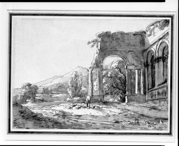 Curator: Piranesi's 1756 etching, "The Roman Antiquities, t. 1, Plate XXXIV. Veduta with Arch of Titus," presents us with a striking vista. What's your initial impression? Editor: Stark. Monumental, of course, but there's a bleakness to it. The shadows are so deep; they nearly devour the details of the stonework. It's more ruin than triumph, it seems. Curator: Indeed. The crumbling architecture speaks to the ravages of time. Look closely at Piranesi’s etching technique; he masterfully uses line and shadow to depict not just the physical structures but also the weight of history pressing down on them. How do you think this detailed depiction contributes to our understanding? Editor: Consider the arch itself: erected to commemorate Titus's victory in the Jewish War. Its imagery – menorahs, spoils of war – are powerful symbols, laden with trauma and conquest that resonates even now. Piranesi captured more than architecture, he captured cultural memory, and its distortions over time. The etchwork reveals an empire built through the consumption and control of labour. Notice, also, the figures that make up the labor for this piece – Piranesi wasn't just interested in the grandeur of the arch, but in representing Rome's relationship to production. Curator: Fascinating points. Let's not overlook how Piranesi utilized printmaking. As a medium, etching is significant here; a fairly reproducible means for wider distribution of Roman ideals across Europe – transforming architecture and triumphal imagery into accessible commodities. The contrast he creates also emphasises a drama through light. Editor: Precisely, those contrasts. I think it's a lament; a visual representation of vanished glories and the shadows of their impact that linger into our modern period. Curator: Agreed. The echoes of history – tangible, unsettling. It forces us to confront what’s lost and the ways our past informs us. Editor: It's a profound work that reminds us to always be mindful of where materials are being sourced.