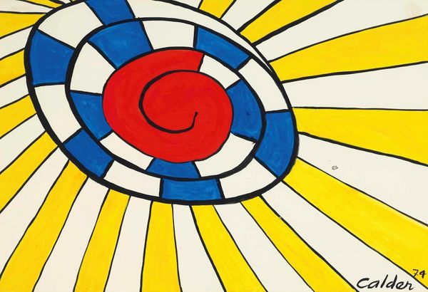 Curator: This is an "Untitled" acrylic painting created by Nicholas Krushenick in 1963, placing it firmly within the Pop Art movement. What are your first thoughts? Editor: Energy. Raw, visual energy. The stark colors and bold lines feel like an explosion, contained just barely within the frame. It vibrates with tension. Curator: I'm intrigued by your "explosion" reading. Formally, consider how Krushenick employs a limited palette – red, yellow, white, and black – to create that effect. The hard-edged shapes, predominantly triangles and rectangles, interlock to establish contrast and directional forces, and consider the black outlines. What are your thoughts on his graphic simplification and outlining technique? Editor: The simplification pulls from comic book art. That outline evokes the retro "pow" of superhero action—violence made visually palatable, almost comical. I see it speaking to post-war anxiety through a lens of pop culture. This central white form reads to me almost as bone fragments from an unseen implosion event or like stylized lightening. What’s your reading of it? Curator: Interesting point. The white figure at its center can be viewed as a burst, maybe the flash point. But to focus more abstractly, let's think of how it directs the composition: note that it sits slightly off-center. Then let us consider its asymmetrical design where Krushenick makes the white form a compositional key that creates tension in pictorial balance and geometric disruption. Editor: This makes me reflect on the idea of “pure” form that we sometimes impose on Abstract works. To me, this isn’t quite free of all association. Perhaps the "un-contained” forms are reaching out, alluding to a Cold War fear of expanding threats. Curator: That reading enriches the artwork for me, as initially my focus rested on the piece's formal mechanisms alone—the dialogue between flatness and illusion created by its simple forms and bold colour choices. Editor: And conversely, you've heightened my awareness of its design— how it manages to be simultaneously unsettling and undeniably stylish through formal constraints.