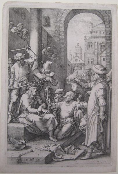 Editor: This is Abraham Hogenberg’s "Christ before Pilate," from around the late 16th or early 17th century. It's a small print, but the composition feels really dramatic. What do you see in this piece? Curator: I see a powerful indictment of institutional power. Pilate, enthroned, represents the state, complicit in violence against marginalized figures like Christ. Consider the historical context: Hogenberg was working during a time of religious upheaval. Editor: So, the print is less about the biblical story and more about… Curator: About critiquing how authority can be manipulated to oppress dissenting voices. How does that reading resonate with you? Editor: It gives the image a totally new weight. I never thought about its political implications. Curator: Art often reflects and refracts the sociopolitical realities of its time.