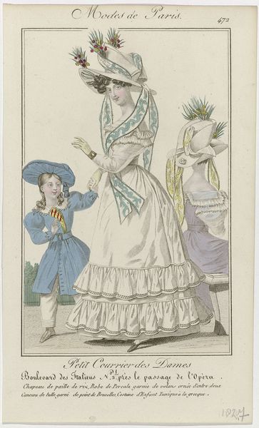 This fashion plate titled Petit Courrier des Dames was made in Paris in 1825 by an anonymous artist, and was printed using engraving and etching. This print offers a snapshot into the sartorial codes of the French upper class, with its depiction of a man in a tailored overcoat and a child in a stylized Scottish outfit. The image speaks volumes about the construction of identity through clothing and the performance of social roles. The man's attire, with its emphasis on cut and detail, signifies wealth and status. The child's costume exoticizes Scottish culture, turning it into a fashionable commodity for the Parisian elite. The print evokes the era's fascination with appearances and the intricate social rituals surrounding fashion. It prompts us to consider the power dynamics inherent in the act of dressing, and how clothing can both reflect and reinforce societal hierarchies. It embodies how fashion can be a tool for expressing personal identity and for participating in broader cultural trends.