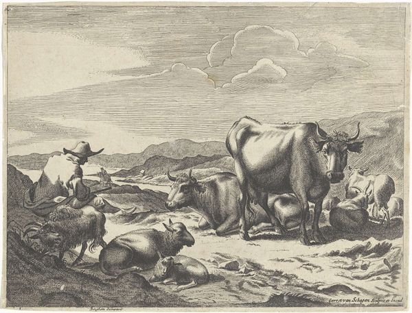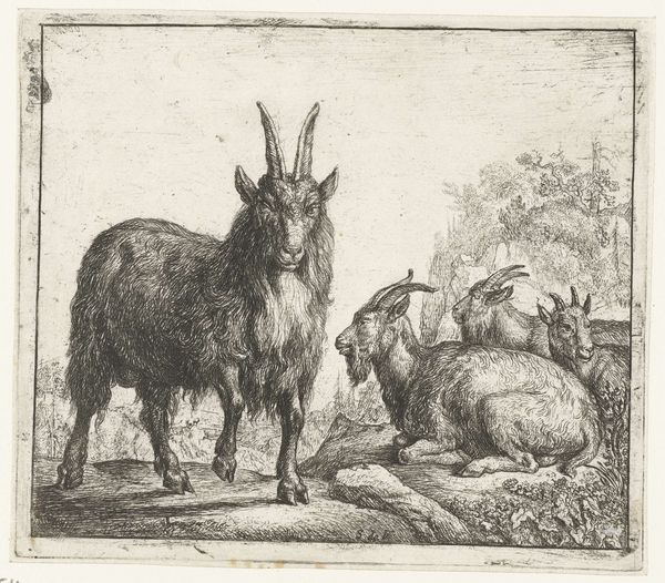 Curator: Looking at Reinier van Persijn's "Landscape with Two Goats and Two Horses" from 1641, made using engraving techniques, I'm immediately struck by its pastoral simplicity. What are your initial impressions? Editor: I notice first the stark contrast produced through the engraving process. It creates a sense of weightiness, almost a sculptural presence to these animals despite the delicate lines. I’m interested in how the material qualities contribute to the subject’s impact. Curator: Indeed, and if we consider the social climate of the Dutch Golden Age, landscapes like these became a vehicle to express national identity and pride. Animals, often seen as symbols of rural life, ground us in the specifics of a nation defining itself through its land and produce. What labour underpinned that world? Editor: Precisely! And the printmaking itself echoes that focus. Engraving demanded specific skilled labor, its own kind of artisanry separate from painting or sculpture, and arguably more accessible. Consider how these prints circulated. Was the landscape accessible to all who could appreciate them as printed items, irrespective of class? Curator: A crucial point. Looking at this through a contemporary lens, we must acknowledge how such idealized landscapes could sanitize or romanticize the realities of agricultural labor. There were inequalities etched into society as sharply as those lines on the page. Who owns land; whose labour makes it valuable? Editor: And, of course, that's critical to understanding not only the social but the material realities of the art’s production as well. Where did Van Persijn source his tools, what were they made of and from where, who taught him the craft of engraving? It situates the artwork in a broader web of production and consumption. Curator: Exactly. Van Persijn is reminding the world how the idyllic vision of life, which has become a global capitalist motif is constructed on an exploited workforce. How we represent that affects political policy, and thus the lives of the workers. It can be considered, on one hand, a celebration of natural beauty; on the other, the means of legitimising brutal practice. Editor: It allows us to explore the material connections linking artistic representation, labor, and socioeconomic structures. Looking more closely at the means of production invites critical awareness of the art itself. Curator: This examination gives new depth, I think, to our appreciation of the intersection of Dutch landscape and historical context in this single work. Editor: Agreed. Considering materiality allows to unearth the often-hidden infrastructure supporting its making and meanings.