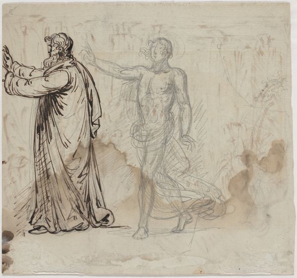 Curator: Looking at this preliminary drawing from the Renaissance—"Aanslag op Caius Marius" by Francesco Ruviale—I'm struck by the artist's confident hand and masterful arrangement. What are your initial impressions? Editor: There's a raw intensity, certainly. The spare lines capture movement and high drama; it’s like witnessing a scene unfold on a darkened stage. The grayscale palette creates an austere, somber mood. Curator: Absolutely. Ruviale rendered this historical narrative using pen, ink, and pencil on paper, likely as a study for a larger history painting. Caius Marius, a Roman general and statesman, was a pivotal figure in the late Roman Republic. The attack shown is part of his complex legacy of both triumph and political strife. I can see how the figures feel so important and intense within the drawing itself. Editor: Yes, the stark composition draws my eye. The architectural background dividing the figures feels significant, almost like the characters are split by opposing forces. The figures have simple tunics. From a purely formal viewpoint, it brings balance. It is an interesting contrast of forms. Curator: Right, and the figure on the left, presumably Marius, stands almost passively, absorbing the violence while the figures advance. What does that juxtaposition communicate about the narratives this image carries for our present moment? Editor: Perhaps it emphasizes a sense of powerlessness, of fate being inescapable regardless of rank. I do enjoy the dynamic tension within the line work that Ruviale deployed throughout. Curator: His use of line certainly builds a powerful emotional crescendo. By positioning Caius Marius opposite those other, unknown men, we're prompted to ask broader questions about vulnerability and social tensions during the Renaissance, or today. It provokes thought about political turbulence that feels relevant even now. Editor: Ultimately, Ruviale has demonstrated that the simplest techniques are capable of conveying enduring stories, struggles, and themes across time. Curator: Indeed, a striking and timeless commentary captured in the language of line and form.