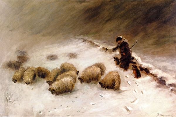Anton Mauve painted "The Return of the Flock, Laren" using oil on canvas. The subdued palette evokes a landscape filled with muted browns and greys, creating a sombre atmosphere. The mass of sheep, depicted with thick, impasto brushstrokes, dominates the foreground, their woolly forms blurring together as they move toward the viewer. Mauve employs a horizontal composition, dividing the canvas into earth and sky. This division emphasizes the flatness of the Dutch landscape and the cyclical nature of rural life. Consider how the direction of the flock leads the eye into the depth of the painting. The shepherd figure is almost indiscernible against the horizon, highlighting the insignificance of man amidst nature. The painting functions as a signifier of pastoral traditions, reflecting an idealization of rural simplicity. Yet, the lack of clear details and the muted tones perhaps subtly challenge this romantic view, hinting at the harsh realities of agrarian existence. "The Return of the Flock" is not merely a depiction of sheep but an exploration into the deeper structures that shape our perceptions of land and labor.