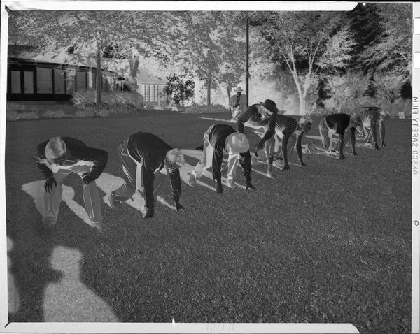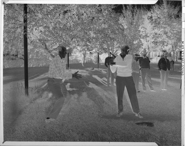 Curator: This is an untitled photograph by John Howell, found in the Harvard Art Museums, depicting men playing golf. The dimensions are 10.16 x 12.7 cm. Editor: The ghostly palette transforms a sunny day on the green into something a little haunting, don’t you think? It's like a memory fading. Curator: Given the historical context of golf as a leisure activity primarily accessible to privileged white men, this image prompts questions about social stratification, class, and exclusion. Editor: Or perhaps it's just a snapshot of a nice day out. The swing, the hats, the camaraderie – it's universally human, no? The inverted tones give it a quirky twist. Curator: I'd argue that even seemingly innocuous images are never truly neutral. The camera, the photographer, the subjects – they are all implicated in power dynamics. Editor: Well, I still see a bit of magic here, a playful inversion of light and shadow that makes me smile. It's a golf party in an alternate universe! Curator: Ultimately, our interpretations depend on our own positions and experiences, shaping how we view this photograph and its place within broader social narratives. Editor: And that's what makes art so darn interesting! It's a Rorschach test for the soul.