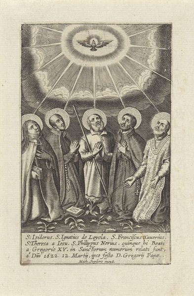 Theodoor Galle created this engraving, "Vision of Saint Dominic", around the turn of the 17th century. Galle worked in Antwerp, then a hub of Counter-Reformation art, where artists visualized Catholic doctrine, often with an intensity aimed to inspire piety. Here, Saint Dominic kneels in a landscape, his arms open to the heavens. Above him, the Virgin Mary stands on a cloud, sheltering a crowd of figures under her cloak. This illustrates a vision granted to Saint Dominic, revealing the protection Mary offers to the Dominican order. Consider the emotional appeal here. Galle creates a direct link between the earthly and the divine, with Dominic as the conduit. There is a sense of comfort in the idea of being enfolded within Mary’s cloak, safe from the world. Notice how the Virgin Mary is presented as a figure of power and refuge; she is both Queen of Heaven, crowned with stars, and a maternal protector. Galle's engraving reflects a society grappling with religious upheaval. It is both a devotional image and a political statement, reinforcing the importance of the Catholic Church and its saints, while offering solace and a promise of protection.