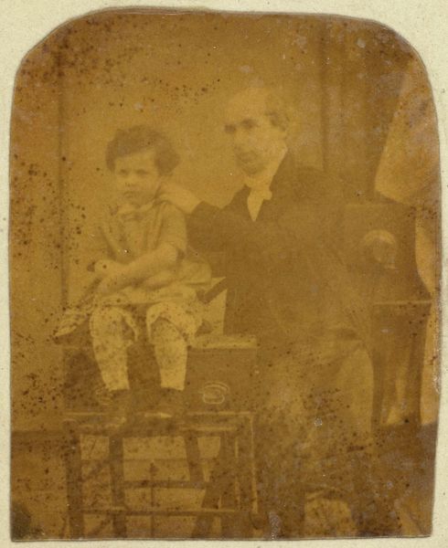 Editor: Here we have Thomas Eakins's photograph, "William J. Crowell with Ella," from 1880. It feels incredibly intimate, despite being a formal portrait. What jumps out at you about this image? Curator: Well, let’s consider the social context. Eakins, though celebrated now, faced controversy for his challenges to academic conventions and Victorian prudery. This photo, featuring a man and child nestled amongst overgrown foliage, moves away from sterile studio portraiture. How do you think the setting—the natural world—shapes our understanding of their relationship? Editor: It almost feels like a refuge, away from societal expectations. It is also interesting that there is no pretense here, in the expressions or pose, perhaps it hints at genuine connection. Curator: Exactly. Eakins's commitment to realism can be seen as a challenge to idealized representations prevalent at the time. How does this photographic realism—the seemingly unposed nature of the subjects, the imperfect backdrop—intersect with evolving ideas about masculinity and childhood in the late 19th century? The man has a full beard and seems somewhat stern, but contrasts the soft foliage surrounding him. How might this be interpreted through the lens of gender studies? Editor: Perhaps a critique of the stoic ideal, allowing for tenderness. It makes you wonder about the role photography played in shaping, or even challenging, those norms. Curator: Precisely. Early photography like this was becoming accessible. In which case it holds immense power in documenting social realities and, at times, contesting prevailing ideologies surrounding identity, class, and gender. Editor: So much more than just a portrait! It has really changed the way I view the piece. Curator: Me too. It also underlines the fact that a photograph holds much social data, waiting to be explored.
