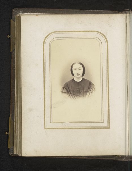 This is a portrait of a woman with a book, presumed to be Miss Sievers, made by Johan Hendrik Hoffmeister. It is a small print with a subdued palette of sepia tones, giving it a sense of intimacy and historical distance. Hoffmeister plays with compositional structure, using the book as a focal point held by the sitter, whose gaze meets ours, engaging us directly. The woman’s plaid shawl introduces a pattern that contrasts with the smooth, almost porcelain-like treatment of her skin and the simple lines of her dress. This photograph is not just a record of appearance, but also a statement about the sitter's character, hinting at intellect and contemplation. The visual language of the portrait, with its carefully arranged elements, invites us to consider the relationship between representation, identity, and the silent narratives embedded within the photographic form.