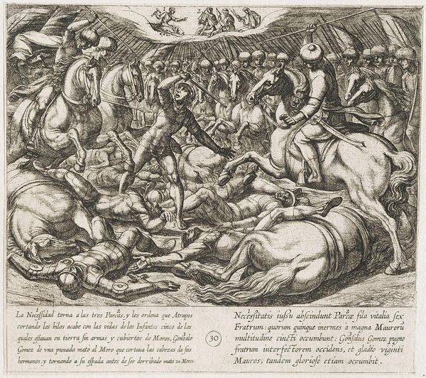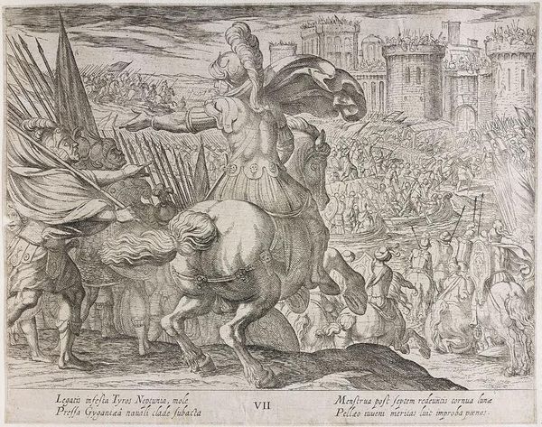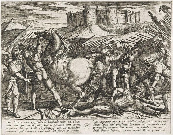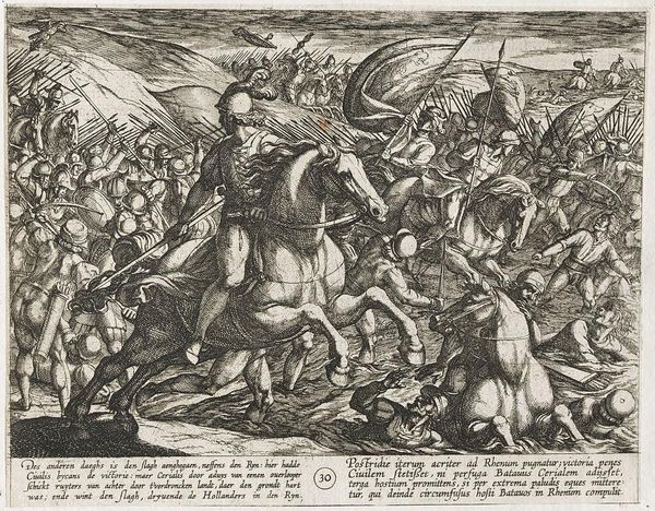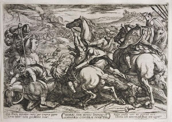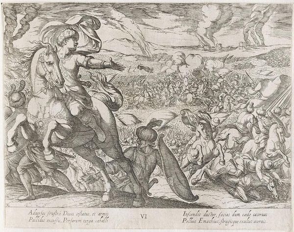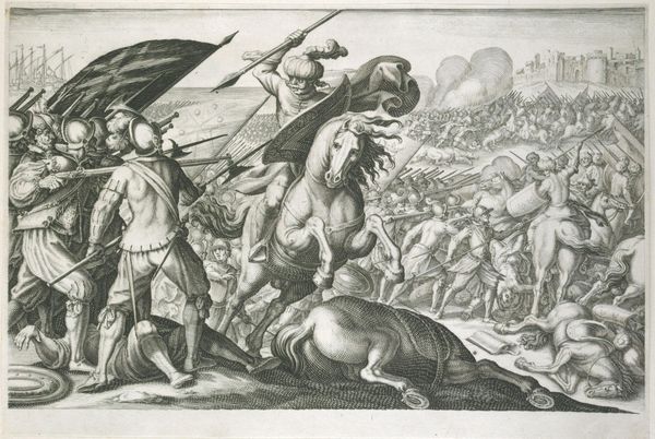 Editor: This is Antonio Tempesta's "Alexander Battling the Persians," created sometime between 1555 and 1630. The scene is chaotic, a mass of figures and horses rendered in intricate detail. What strikes you most about its composition? Curator: Note the dynamism achieved through the dense layering of forms. Tempesta masterfully uses line to create a sense of movement and disorder, emphasizing the violence of combat. Observe how the overlapping creates spatial ambiguity. Editor: The lines are incredibly detailed, almost overwhelming. How does that affect the viewer’s perception of the piece? Curator: The density invites close inspection, but also overwhelms the eye. This visual tension mirrors the chaos of battle, drawing the viewer into the conflict. Consider the interplay between light and shadow, achieved purely through line. Editor: That makes a lot of sense. I hadn't considered how the technique reinforces the subject matter. Curator: Indeed, the formal elements are inextricably linked to the narrative. It's a powerful example of how composition dictates meaning.
