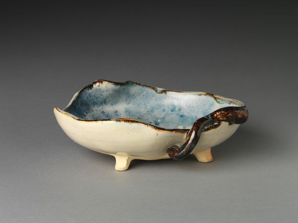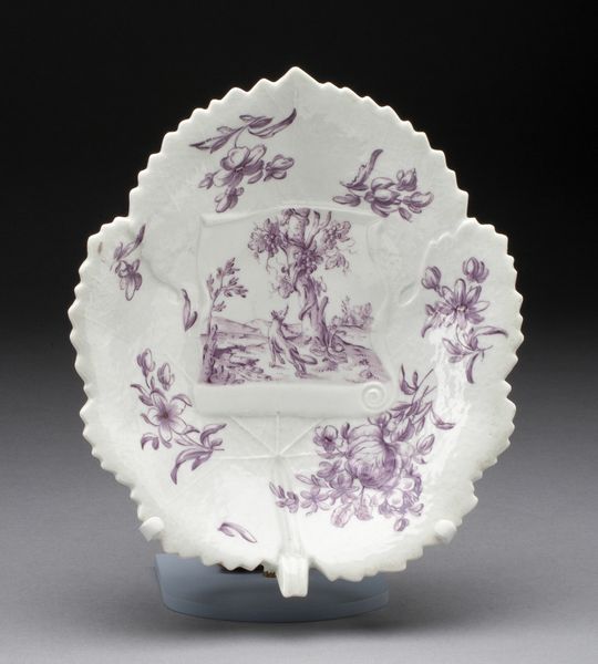 Editor: Here we have a "Schaal met geschulpte rand, op het plat beschilderd in paars met een landschap met ruïnes," made by the Weesper porseleinfabriek, circa 1759-1771. It’s a small ceramic dish, really quite lovely, with this delicate purple landscape. It’s giving me very pastoral, almost melancholic vibes. What’s your take on it? Curator: The porcelain itself speaks volumes. This wasn't just a vessel; it was a display of wealth and technological prowess. Notice how the Weesper factory imitates more expensive, imported porcelain. It’s a statement about Dutch manufacturing aspirations. Editor: So, the porcelain body itself is significant? Curator: Absolutely! And the landscape is not simply decorative. Think about the social context: The ruined landscape becomes a popular motif amongst the elite, offering them an opportunity for picturesque reflection and escapism from their rapidly industrializing world. Editor: Huh, so even the choice of landscape can tell a story. How was purple achieved in the mid-18th century? I imagine the process would influence the aesthetic greatly. Curator: Precisely! Achieving that shade of purple involved a complex firing process with specific metallic oxides, which made the color itself valuable and indicative of skill. Consider the labor involved in mining and processing these materials. What does this miniature landscape, contrasted with the extensive resources and effort that produced the dish itself, communicate? Editor: I see what you mean. It sort of shrinks the romantic landscape, highlighting instead all that goes into presenting it. I wouldn’t have thought about all of that initially, so thanks! Curator: My pleasure! Considering materiality allows us to really unpack the layered meaning of everyday objects like this.