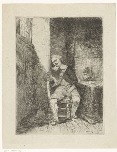 Pieter Nolpe created this etching titled "Slapende boer, zittend op een bank" - or "Sleeping farmer, sitting on a bench" - in the 17th century. Notice the intricate network of fine lines which define the sleeping farmer and his boisterous companions. Nolpe masterfully employs line and composition to create a scene that feels both intimate and slightly chaotic. The central figure is slumped against a rough wooden structure, his posture relaxed, and a flagon rests on his lap. Meanwhile, in the background, other figures revel, one raising a glass in jovial cheer. This contrast, carefully constructed, explores different states of being. Is Nolpe commenting on labour, leisure, or perhaps the effects of drink? The artist also prompts us to consider the broader context of Dutch Golden Age art and its fascination with everyday life. In this work, Nolpe uses formal elements to not only depict a scene, but to explore the subtle tensions and ironies inherent in the human experience. This piece invites ongoing interpretations, ensuring its continued relevance.