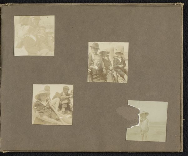 These three small photographs of people in the dunes of Noordwijk were taken by Carolina (Loentje) Frederika Onnen. The sepia tone and arrangement on the album page create a nostalgic tableau, evoking a sense of a bygone era. Each photograph presents a distinct composition. In one, figures are nestled amidst the dune grasses, almost camouflaged by the natural setting. Another shows a group of figures posed in a more formal arrangement. The third composition has figures resting and interacting. The images, with their variations in perspective and arrangement, explore themes of social interaction, leisure, and the relationship between the figures and their environment. Though seemingly candid, each photograph is carefully composed, presenting a curated view of social life in the dunes. The arrangement of the photographs on the album page further emphasizes their constructed nature, transforming personal snapshots into a deliberate visual narrative.