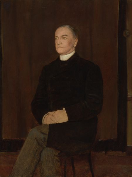 Curator: Frank Holl's commanding portrait, simply titled "Samuel Cousins, R.A.," presents us with a compelling study in somber tones and textures. The canvas itself is quite large, over a meter in both height and width. Editor: The subdued palette really strikes me—it evokes a mood of quiet contemplation, almost resignation. The sitter's gaze seems distant, burdened perhaps by the weight of years or societal expectations. Curator: Cousins was himself a celebrated engraver, deeply immersed in the reproductive print industry. Holl’s brushwork seems deliberate, almost echoing the meticulous labor of engraving, don’t you think? Editor: Indeed. The formal attire, the presence of another framed artwork in the background—they hint at a life shaped by artistic production, yet also constrained by the norms of the time. I wonder about the relationship between artist and sitter, and how that power dynamic shapes the final image. Curator: It's a fascinating interplay, isn't it? The canvas, the paints, the brushstrokes—each element a testament to the labor involved in crafting not only an image, but also an identity. Editor: Ultimately, Holl delivers something incredibly complex through that labor: a commentary on aging, artistry, and the quiet struggles within a life dedicated to creative practice. Curator: Absolutely, and it is through this lens that we can examine the very materiality of artistic creation as a socio-cultural document.