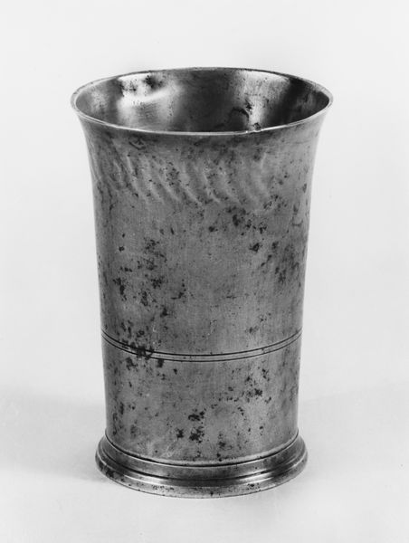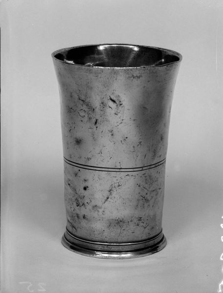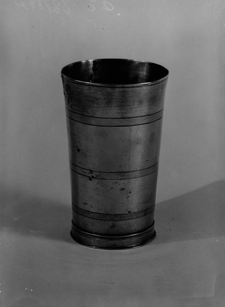 Curator: What immediately strikes me about this beaker is its somber, almost utilitarian aesthetic. Editor: Indeed. The “Beaker,” crafted by Thomas Danforth Boardman sometime between 1810 and 1850, speaks volumes about early 19th-century American craftsmanship. Considering the era, its unadorned presence is quite powerful. It resides here, at the Metropolitan Museum of Art. Curator: The simplicity lends it a profound sense of historical weight. I am captivated by the form – such as, what were vessels such as this one designed to carry, how many hands has it passed through? And what stories does its existence, use, and journey tell us about early Americans and the material culture of the era? Editor: If we dive into symbology, you see echoes of classical forms in the simple, flared lip and the circular banding on the vessel body. Circularity representing completeness, continuity, like the water it was probably designed to carry. The beaker becomes a potent vessel, holding within it, metaphorically and actually, life and memory. Curator: Absolutely. Thinking about its creation against a backdrop of shifting social structures, one can almost read it as a statement of democratic principles through domestic life. It embodies a form of everyday accessibility and a challenge against ornate, aristocratic tastes. Editor: Perhaps. I would say this visual motif certainly served to provide continuity in a rapidly changing world, anchoring users in familiar and timeless ideals, offering comfort. The design is reassuring; an assurance of longevity that has clearly manifested into the present day. Curator: Ultimately, the beaker serves as a compelling reminder of art's vital function in everyday life. Editor: Precisely. An enduring emblem of material culture and human interaction.