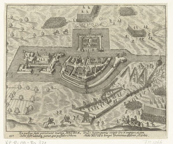 Pieter Bast created this print titled, Beleg en verovering van Meurs, 1597, around 1597. This print offers an aerial view of the siege and capture of the city of Moers during the Eighty Years' War, a conflict rooted in religious and political tensions between the Dutch and the Spanish. As you look at the image, consider the power dynamics at play. Who gets to decide whose history gets told and how? Bast's detailed rendering of military strategy and troop movements seems to glorify the art of war, yet it also reveals the human cost of such conflicts. It's interesting to consider how images like these can shape public opinion and collective memory. Were these depictions of war intended to instill pride or perhaps to serve as a cautionary tale? Whose perspective is prioritized in this narrative, and whose voices are silenced or marginalized? This print not only captures a moment in time but also invites us to reflect on the complexities of war, power, and representation.