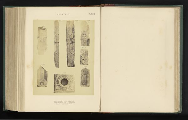 Curator: This photogravure presents what are referred to as, "Four Columns with Reliefs," dating back to before 1868, showcased in a publication by William H. Griggs. My first thought is that the ancient artisans, in marking each column so exquisitely, saw themselves inscribing knowledge not merely onto stone, but across time. Editor: That's a lovely image, but what speaks to me immediately is the damaged state. Look at the column furthest to the left, or even the chipped head of the second one—ruin is present within representation, a sign of what decays or has been violently pulled apart in the name of power. Where might these columns have been situated and by what community of people were they used and venerated? Curator: Ah, yes, I can understand what you mean about the ruin that we can witness here. They feel like survivors bearing scars. From an art perspective, it also allows our imagination some room to take hold of it. What do you imagine they would've supported? A palace? A temple? Editor: What if we consider how sites like these—in all their fragility—were spaces of both material value and symbolic currency under imperial-colonial occupation? Curator: Hmm. The symmetry within each unique shape is, to me, the most impressive visual fact in this work. Despite all the chaos in our own existence, it provides us with an inner sense of completion and organization. Perhaps a mirror to how our brains desire to exist, if that makes any sense. Editor: It makes sense, but it's incomplete without considering this particular ruin's location in relation to global circuits of value. This symmetry might reveal the ideological order that art historians and curators often seek in classical aesthetics while erasing the realities of plunder. The image and description together strike me as part of a colonial project aimed to codify and control. Curator: And there is the crucial collision point between us as thinkers—colonialism versus craft, both true. Thinking of my initial impression now, what I interpreted as a form of gentle knowledge might also be the remains of something deliberately crushed. Editor: Precisely! Seeing isn't believing, it's understanding how what you're seeing comes to mean in a historical moment, and to whom. And perhaps we can encourage our listeners to continue with their own discoveries, too.