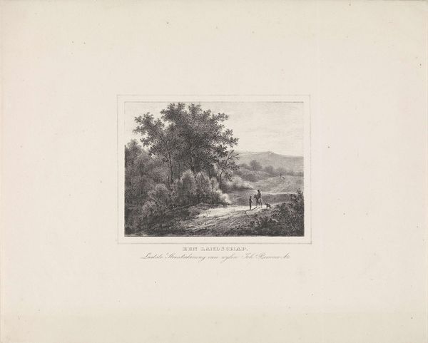 Editor: This is Marie Alexandre Duparc's "Landscape," a print from the late 18th century. The composition strikes me with its deliberate arrangement, almost like a stage set. What elements of its formal structure stand out to you? Curator: The meticulous gradation of tone is particularly striking. Observe how Duparc uses light to define form, creating depth through contrasting values. Consider, too, the relationship between the foreground and the distant castle. Do you perceive a clear hierarchy? Editor: Yes, the foreground is more detailed, drawing my eye in, but then it leads me to the castle in the distance. Curator: Precisely. This strategic use of perspective guides the viewer's gaze, creating a visual pathway through the landscape. This creates a captivating sense of order and structure within the work. Editor: That’s a perspective I hadn’t considered before. Thank you. Curator: My pleasure.