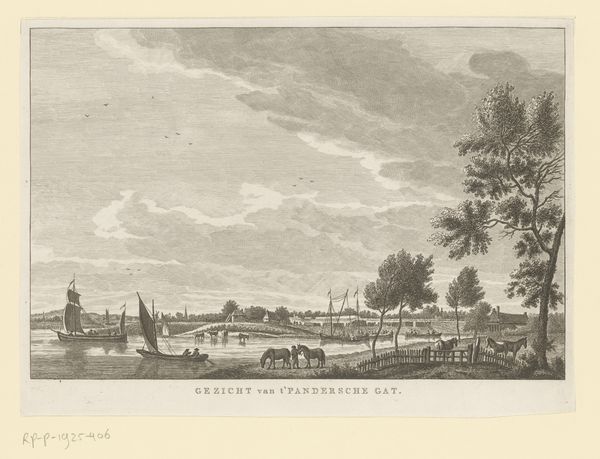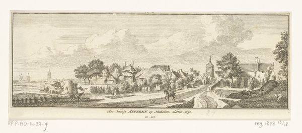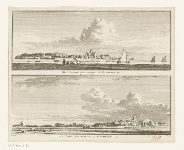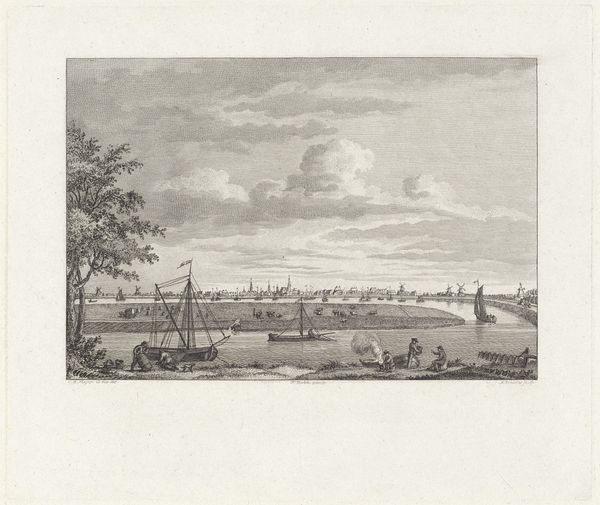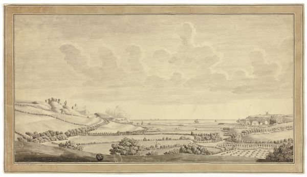 Editor: Here we have Emil Wolff’s "Helsingør og Kronborg," placing its creation sometime between 1800 and 1849. It's a print composed of drawing, lithograph, and etching techniques. Looking at this, I’m immediately struck by the composition—the way the scene unfolds from the foreground up to the castle. What do you see in this piece from a formal perspective? Curator: The beauty here is undoubtedly found within the structural balance. Note how the artist orchestrates a sense of depth through meticulous tonal gradations, employing varying densities of line work in the foreground, middle ground, and background to establish recession into space. The strategically placed windmill mirrors the silhouette of Kronborg Castle, creating a visual echo, binding the composition and establishing equilibrium. Can you see the implications of this conscious placement? Editor: So, the mirroring effect isn’t accidental—it is there to create a balance within the image. The shapes are intentionally repeated. Curator: Precisely. The artist utilizes semiotics; this conscious act signifies intentionality and establishes structural integrity. Examine also the rhythmic interplay between the natural forms and the architectural ones. The organic curve of the road and trees contrasts yet complements the straight lines and sharp angles of the buildings. Editor: I’m starting to appreciate the attention to detail and balance, things I hadn't initially noticed. It is more than just a landscape. Curator: It speaks to the profound connection between structural design and meaning. Wolff orchestrates visual form that reflects how art mediates nature and culture. It invites us to decode, question, and challenge our perceptions of the visible. Editor: Thank you. I can definitely look at the image now and admire the compositional strategies and repeating motifs that construct the harmony and tension within the work.