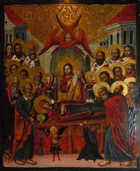 Editor: This is the "Dormition of Virgin Mary," a tempera and oil painting from around 1500. It's such a striking piece! The gold leaf really catches the light, and everyone seems to be floating. What exactly are we seeing here, beyond the obvious? Curator: Floating is the right word! It feels like stepping into a dream, doesn't it? It's a layered story, really. We see Mary, surrounded by those who loved her – apostles, grieving figures. Above, she’s being received into Heaven, body and soul, an event rendered as another little Mary within the mandorla carried by angels. And then there's Christ...holding a small childlike figure… who could that be? Editor: Hmm, that's interesting... I had assumed that all figures surrounding Mary belong to this world, while the upper ones reside in the Heavenly world. You think it's the same story at two points in time? Curator: Not exactly, but iconographic tradition does something magical with time here. Notice how it flattens everything out – compresses past, present, and future into one simultaneous moment. As if one frame captured eternity. Like trying to fit the cosmos into a teacup! Is that making sense? Editor: Kind of. So it's not a literal depiction of a single event, but more of a symbolic representation of a core belief... a sort of "both/and" situation rather than an "either/or?" Curator: Precisely! It's Byzantine art at its finest - aiming straight for the soul, bypassing logical explanations. Consider also that harsh perspective and those strange architectural constructions... they work to take our minds out of natural space. More food for thought, wouldn’t you agree? Editor: Definitely! It’s funny, at first glance it just seemed like a historical painting, but now it feels much more complex and alive, reaching across time and belief. Thank you. Curator: The pleasure's all mine! It reminds me that truly great art keeps giving, unveiling layers each time we encounter it. Until next time!