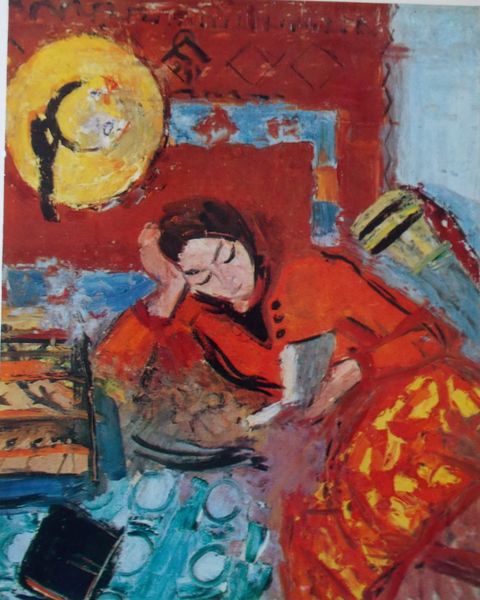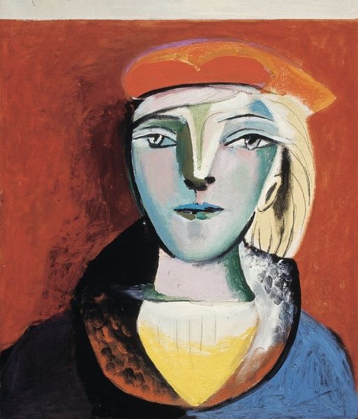 Editor: This is Egon Schiele’s “Portrait of a Woman,” painted in 1912, using oil paint. The colours are striking, especially against that intense red background, and I’m drawn to the almost fragmented way he's depicted the woman’s clothing. What's your perspective on this portrait? Curator: Thank you. Analyzing this work through a formalist lens reveals Schiele's mastery of expressive line and color. Observe how the composition emphasizes the subject’s angularity, particularly in her face and hands. The chromatic tension, particularly between the vibrant, almost clashing hues of red, green and browns, creates a sense of unease or agitation. Editor: I see what you mean about the colours creating tension. Is that tension mirrored anywhere else? Curator: Precisely. The disjointed forms, rendered with bold, decisive strokes, contribute to the overall psychological intensity. Semiotically, these formal elements convey a sense of vulnerability and anxiety, inviting speculation on the artist’s state of mind or perhaps mirroring early 20th-century Austrian society. Editor: So it’s not just about *what* he painted, but *how* he painted it that conveys so much meaning? Curator: Precisely. Formalism redirects us from representational concerns to focus on the intrinsic qualities of the painting itself, examining how colour, line and composition come together to produce meaning. What do *you* make of the heavy outlines? Editor: It really does trap the subject. Thank you, this piece really shows me how line and colour have intention behind them. Curator: My pleasure, by looking at the form we’ve accessed the intention of the artist.
