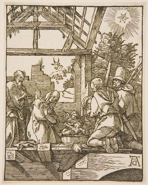 Curator: Here we have "Engraved copies of The Little Passion," an artwork attributed to Albrecht Dürer dating sometime between 1485 and 1699. The prints and drawings comprising the artwork are currently located here at The Metropolitan Museum of Art. Editor: It strikes me as meticulously rendered, though almost overwhelmingly detailed. All those fine lines—I wonder what it feels like close up, as a physical object made in a workshop setting. Curator: As you suggest, the emphasis is not just pictorial; there is a complex symbolic architecture. Observe how the angel in the scene above the manger mirrors the larger angel announcing Christ's birth, forming a visual echo across planes. The Virgin's humble stance and downcast gaze evoke themes of piety and acceptance—of preordained events shaping history. Editor: But consider also the engraving process. Dürer wasn’t simply illustrating a narrative. It’s evident these copies suggest something more complex regarding distribution. Engravings like these were commodities, reproduced and circulated widely. That impacts the spiritual intent you mentioned, surely? Curator: Undeniably. It takes a very personal religious experience and renders it… repeatable. This challenges our notion of authenticity; it prompts considerations of accessibility. Does wide dissemination amplify its meaning, diluting its power as cultural currency? It’s also remarkable how such intense spiritual narratives get transformed, reproduced through labor and trade. Editor: It truly makes one consider how the symbolic importance of materials fuses with manual work and exchange to shape the cultural story. And from the lines you find etched onto the paper to where that story finds a home with an owner–it is all part of one circuitous, meaningful voyage. Curator: Indeed. Exploring artworks like these allows one to acknowledge continuities within both spiritual symbolism and broader, more culturally oriented, and socially oriented narratives, I find it fascinating.