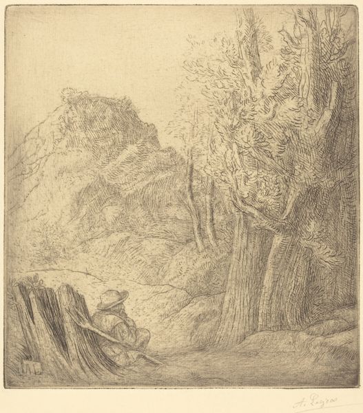 Curator: Franz Kobell created this etching and ink drawing, entitled “Gebirgslandschaft mit Wasserfällen,” or "Mountain Landscape with Waterfalls." It's part of the Städel Museum's collection. What are your initial thoughts? Editor: It has a distinctly melancholy air to it, despite the vibrancy of the cascading water. The lines, the monochromatic palette—it’s as though nature itself is shrouded in introspection. Curator: Given its status as a print, consider the various stages of labor that had to occur. There's the artist's initial conception, the labor of etching the plate itself, and the reproductive labor inherent in producing multiple impressions. It raises questions about the value and dissemination of art. Editor: But doesn’t the composition, with its focus on dramatic rock formations and dynamic water flow, showcase a keen understanding of visual weight and rhythm? The placement of the figures in the middleground also creates an incredible sense of scale, don't you think? Curator: I find it intriguing how Kobell combines what appear to be carefully rendered topographical studies alongside figures in the middle ground that might suggest some commentary on agrarian labor. This image had to be manufactured, and every level of making, even something seemingly so direct in its subject, tells of the human hands and historical means to do so. Editor: Perhaps. But for me, it's the interplay of light and shadow that captivates. The stark contrast amplifies the drama of the waterfall and invites the eye to traverse the landscape—upward along the cliffs, downward with the rushing water. How does that not strike you formally? Curator: Certainly, there’s a level of spectacle and drama present. Though it could be further argued that this spectacle serves a wider economic goal, positioning viewers within certain ideological assumptions around leisure and labour. Editor: A worthwhile angle to pursue! Seeing it now through that light makes for a compelling view. Thanks for helping me examine this interesting artwork today. Curator: Likewise! These landscapes provide fertile ground to consider production methods, economic factors, and class values. It opens new avenues for me to interpret familiar terrain.
