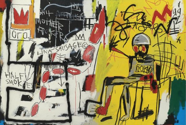 Jean-Michel Basquiat made *Do Not Revenge* with paint and crayon sometime in his short but brilliant career. Look at how the yellow and red under layers create a visual intensity that feels both urgent and raw. The surface is a dense network of marks, lines, and symbols. Notice the skeletal figures, crowns, and scrawled words all jostling for space. The paint application is uneven, with some areas thickly layered and others thinly washed, allowing the underpainting to peek through, which gives a sense of depth, as well as the history of the painting’s making. Take, for example, the skull on the right, its crude outline filled with drips of blue, yellow, and white. The colours seem to run down the face like tears. It's this kind of raw emotion, combined with the complex layering of meaning, that makes Basquiat so powerful. The work of Cy Twombly comes to mind, but really Basquiat is in a world of his own: poetic, angry, and always questioning.