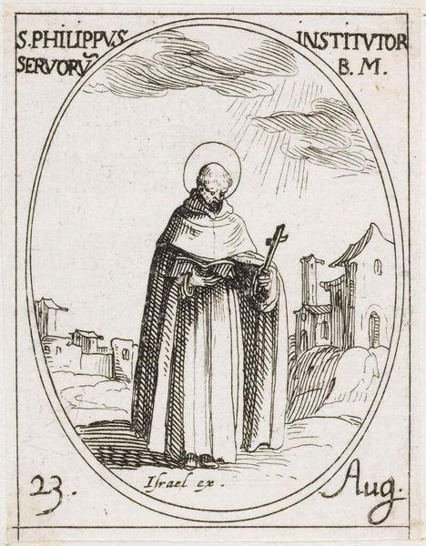 Editor: Here we have Jacques Callot's "Saint Nicholas of Tolentino," a small etching. The figure's intensity is palpable despite the size. What strikes you about Callot's approach here? Curator: The etching process itself is key. Consider the labor involved, the repetitive actions, the acid's bite. Callot's skill in manipulating these materials elevates a common devotional image. It speaks to the commodification of religious iconography in 17th-century Europe and the democratization of art through printmaking. Editor: That's a fascinating way to consider it, beyond just the religious subject. Curator: Exactly. It's about how the image was made, distributed, and consumed within its specific social context. Editor: I'll definitely look at prints differently now.