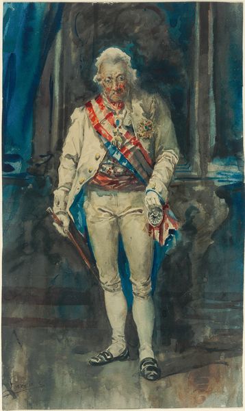 Curator: Oh, this is fascinating! This watercolor is by Giovanni Boldini, and it portrays Raphaël Duflos in the role of Henri III. It has this ephemeral, almost dreamlike quality. What's your take on it? Editor: My first impression? It's theatrical. I immediately think of stagecraft and costume. But the watercolor gives it such a transient, fading feeling, like a memory of a play rather than the thing itself. Curator: That’s astute. I see a blend of power and fragility in it. Henri III, as a historical figure, was quite complex and often criticized, and the choice of watercolor emphasizes that fleeting nature of power. The dark blues of the cape really anchor the piece, though. Don't they speak to royalty in a profound way? Editor: Absolutely. Blue is eternally linked to the divine and noble—think of the Virgin Mary’s robes, for instance. That specific, almost cobalt hue is compelling. It's draped so heavily around him, too, almost like it’s a burden. Curator: The symbolism here is rich. Notice how the actor almost seems to be dissolving into the background? Boldini captures Duflos not just as Henri III, but almost the idea of Henri III, fading from collective memory. It reflects the historical interpretations and judgments of this monarch. Editor: That gesture he makes with his hand— barely suggested, just a few sketched lines—speaks volumes about the gestures of kingship. Is he blessing, dismissing, or simply adjusting his garment? All of those interpretations reflect historical criticism and speculation. The way Boldini leaves so much to suggestion really amplifies its emotional impact. Curator: I agree completely! And you know, watercolor can be such an unforgiving medium. You can’t really correct mistakes; each brushstroke has to be confident, deliberate. I'd say that Boldini captured an exquisite balance here between the concrete details and impressionistic suggestion, making it linger in our minds. Editor: Precisely, it leaves an enduring echo—more haunting, perhaps, than a more sharply defined portrait. Makes you consider how identities both real and fictional can be equally fragile under the relentless gaze of history. It stays with me! Curator: Absolutely. A beautiful, thoughtful rendering—a glimpse into a character within a character. And ultimately, a lovely dance of artistry and historical narrative.