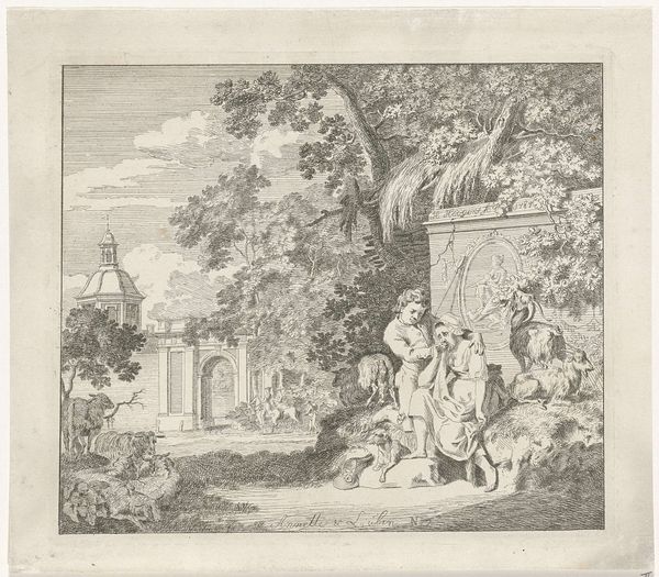 Curator: Ah, yes, here we have Simon Klapmuts's "Arcadian Landscape with a Shepherd by a Spring," dating from around 1770. It’s an engraving, delicate in its execution. Editor: My first thought is of summer haze. It’s so light and airy, the lines almost fade into the background, like a half-remembered dream of the countryside. Curator: Exactly! And that "fading" is deliberate, part of the engraver's skill. Klapmuts, though often overlooked, was a master of line work. Notice the variations in the strokes—thick lines define the foreground figures, while finer ones create depth and atmospheric perspective, almost mimicking the effect of sfumato. We see this play out as we examine the contrast between the two herders, lounging and playing in the foreground in opposition to the barely visible pavilion in the far off background. Editor: The two figures really pop—I am really drawn in to that detail. There's this gentle intimacy that resonates, you almost feel that the two people depicted are the most essential part of the natural landscape surrounding them, if that makes sense? The very human instinct to feel closer with the subject, which I think this evokes a lot. Curator: Perhaps. The social and economic contexts are, of course, vital. During the late 18th century, such idealized pastoral scenes were highly fashionable, appealing to an urban elite that longed for a romanticized vision of rural life, and more specifically an appreciation of Greco-Roman style life and aesthetics. Engravings, being relatively inexpensive and easy to reproduce, facilitated the dissemination of these ideals. Editor: So, a form of consumerism of imagery. I see what you mean about the accessibility, the making of many out of the singular. But also, beyond social consumption, what about simply wishing? Doesn't art offer that-- that little gateway in an otherwise hectic everyday life, regardless of class or economy? Curator: Indeed! I find it a clever, poignant expression from Klapmuts. This idyllic tableau, etched in lines, invites us into a carefully constructed fantasy. It reflects social values while offering the balm of escape and romanticism. Editor: Exactly—and ultimately reminds us of the enduring power of art to soothe and transport.