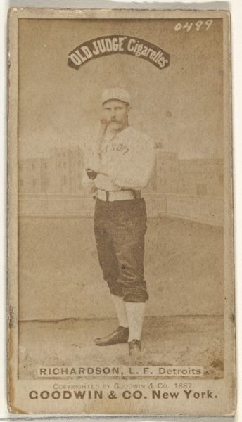 Editor: So, here we have "Timothy Keefe, Baseball Player" from 1887, by Allen & Ginter Cigarettes. It's a small print, quite charming. What strikes me is its almost caricature-like quality, despite being quite a straightforward portrait. What do you see in this piece? Curator: I see a complex web of production and consumption masked as a simple baseball card. The material itself—the cardstock, the inks—speaks to a massive industrial effort aimed at embedding brands like Allen & Ginter into the popular consciousness. Editor: Cigarettes and baseball, quite a pairing. Curator: Precisely! Consider the social context: the rise of consumer culture, the burgeoning popularity of baseball, and the aggressive marketing tactics of tobacco companies. These cards weren't just innocent pictures; they were commodities, literally packaged with another commodity: cigarettes. Think about the labor involved in producing these cards, from the sourcing of materials to the printing process, to the very cultivation of tobacco and baseball as a new social pastime. Editor: So you're saying it's less about the image of Keefe, and more about the systems that created and distributed it? Curator: Exactly! And consider the accessibility of printmaking. A widely available artform such as print allowed Allen & Ginter to cheaply and effectively broadcast the new celebrity figure and consumption culture, bringing art outside traditional institutions into the everyday pocket of common folks. Each card represents a small part of a much larger capitalist machine. Editor: I never really thought about it that way, that something as simple as a baseball card could embody so much about labor and consumerism. Thanks for helping me connect these dots. Curator: My pleasure. Looking at art through the lens of materials and production helps us understand its place within a much wider economic and social framework, even baseball!